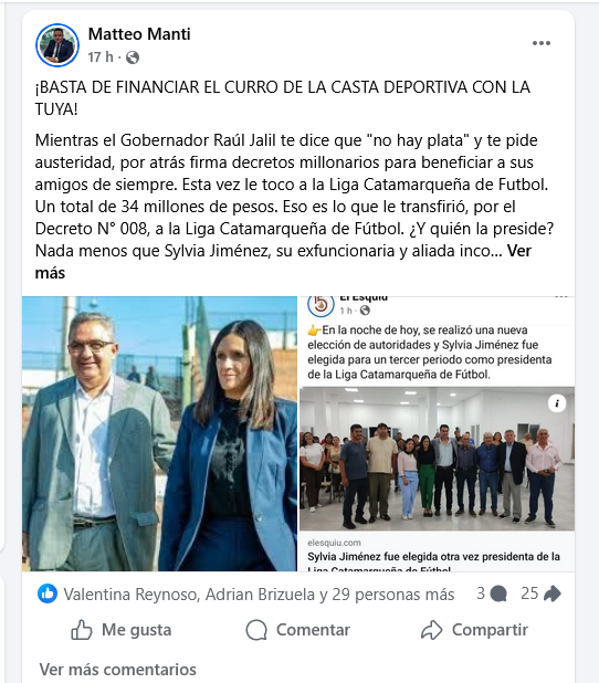 En su publicación, Manti enmarcó la decisión dentro de lo que definió como “la casta deportiva”, y acusó al Ejecutivo de utilizar recursos del Estado para “pagar favores políticos”. En ese sentido, afirmó que “se reparten la plata de los impuestos entre ellos mientras el resto de la provincia mira de afuera”.