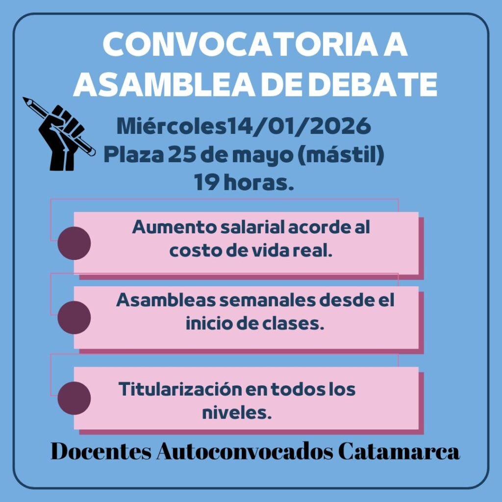 Docentes de todos los niveles y modalidades de Catamarca convocaron a una asamblea de docentes autoconvocados para el próximo miércoles 14 de enero, a las 19:00 horas, en el mástil de la Plaza 25 de Mayo. La iniciativa surge con el objetivo de visibilizar y debatir problemáticas que consideran centrales para el presente y el futuro de la docencia en la provincia.