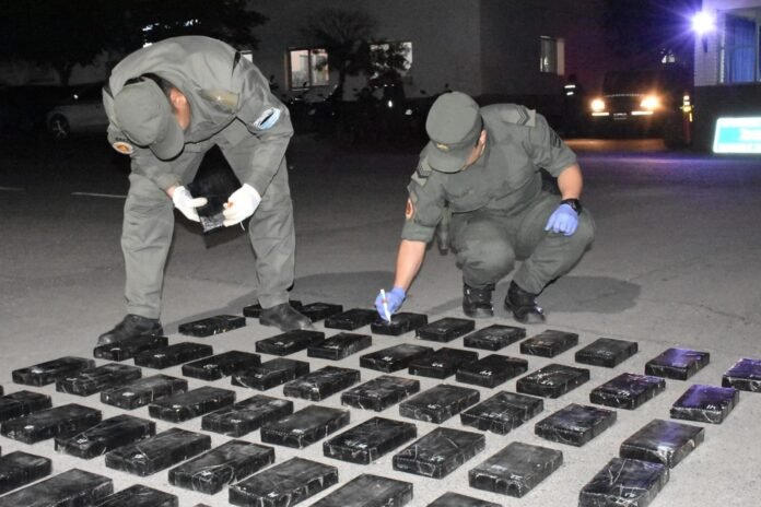 Ante estos indicios, los uniformados trasladaron el operativo hacia el asiento del Escuadrón, donde efectuaron una requisa más minuciosa, mediante el uso de herramientas, sacaron la alfombra y la placa del piso, descubriendo la presencia de 60 ladrillos que estaban envueltos en nylon negro y contenían una sustancia blancuzca.