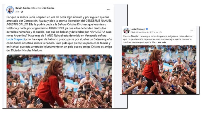 El descargo también apuntó a la cercanía política de Corpacci con la expresidenta Cristina Fernández de Kirchner, a quien instó a intervenir directamente ante el gobierno venezolano. “Si tanto defienden los derechos humanos y al pueblo, ¿por qué no hablan y defienden a Nahuel?”, planteó, al tiempo que remarcó que se trata de “un argentino y un catamarqueño como cualquiera”.