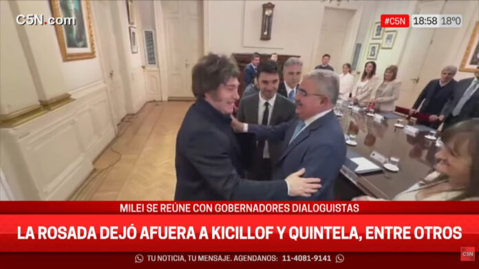 Cada mandatario fue saludado uno por uno al iniciar el encuentro. Y no fue un saludo uniforme: mientras con algunos gobernadores Milei hubo gestos de mayor calidez —un abrazo, una palmada, incluso un beso—, con otros el contacto fue más formal: únicamente un apretón de manos, sin mayor efusión.
