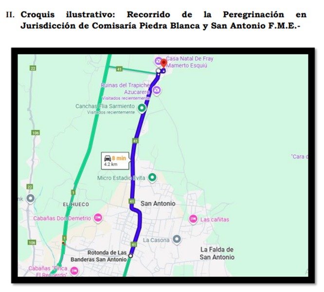 Cabe señalar, que la imagen del Beato Fray Mamerto Esquiú será trasladada en una camioneta desde el punto de partida hasta la intersección de la Avenida Alem y calle Esquiú, donde se dispondrá un dispositivo específico para el descenso seguro del vehículo y reorganización de la columna de fieles. Desde ese punto, el traslado del Beato se realizará a pie, siendo portado de manera organizada por instituciones y entidades designadas, que se relevarán durante el tramo final de aproximadamente seis (6) cuadras hasta el Convento y Templo de San Francisco, asegurando el control del público y la prevención de aglomeraciones.