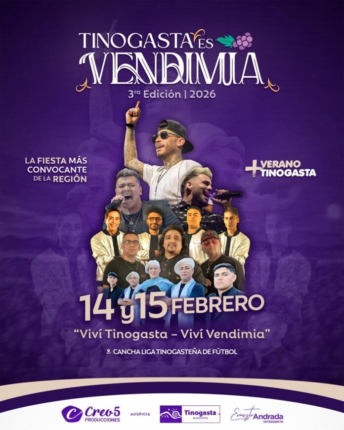 Tinogasta comenzará a palpitar una nueva edición de su fiesta vendimial. Los días 14 y 15 de febrero se realizará la 3° edición de “Tinogasta es Vendimia 2026”, una de las celebraciones más convocantes de la región, que reunirá música, tradición y cultura en dos noches a puro espectáculo.